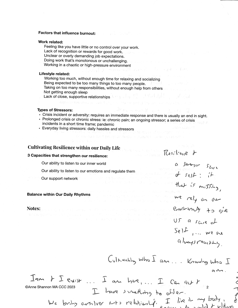 This sabbatical has been rich and full of wonderful and redemptive activity, doing many things I would not have had the chance to do apart from having the time off from my Grace Van responsibilities. So again, thank you Grace Van for providing the opportunity. Regarding the fullness of the last few days, let me describe my Friday through Monday. On Friday, I went to Regent College to participate in an event called The Gathering meant to encourage pastoral health. At the event, I was able to hear from well-regarded Old Testament scholar Tremper Longman who spoke on the Psalms. One of the most powerful moments in Longman’s talk was when he spoke of four general types of Psalms, those of “hymns, lament, thanksgiving and confidence.” And he said that hymns are those psalms that are sung when “things are going well,” when we are oriented to the world. In addition, lament are those psalms that are sung when “things are not going well and there is much sorrow,” when we are disoriented to the world. Thanksgiving are those Psalms that we sing when God has answered our prayers and delivered us from our laments and sorrows, when we are reoriented to the world. But then Longman asked this poignant and powerful question, “what happens when God doesn’t answer our prayers of lament? What then?” And this is where he then went on to speak to the place of “Psalms of confidence” in the Psalter, that songs of confidence are sung when prayers are not answered and deliverance has not yet come. And then Longman went on to unpack Psalm 131 as a Psalm of trust and confidence, to show us what the Psalmist does in those times where reorientation has not yet come, how he calms his soul to renewing his trust in God even in the muck and the mire of his life. That was really a powerful insight into the Psalms. And then later on Friday, I was able to hear a talk from Christian counsellor Anne Shannon who talked about “Cultivating Resilience for Stressful Times” and in particular addressed factors that contribute to burnout. I include a page of my notes here for your reflection: