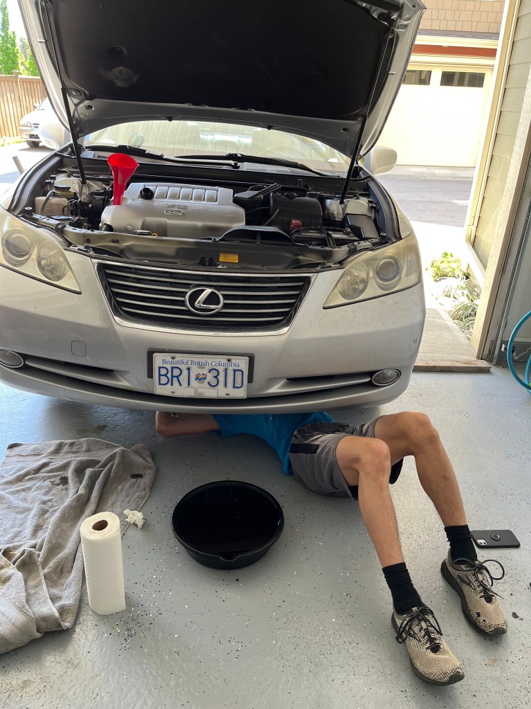 The evening ended with a dinner at Jericho Beach. I also enjoyed networking and connecting with some other Vancouver ministry leaders. So that was my Friday. Unfortunately, I was not able to do day two of the event, because my Saturday was quite fully scheduled. In the morning, I did my two-hour Zoom book study with three others (normally there are six others but three could not make it) and looking over a chapter in Watkin’s book on “Sin and Society,” we found the conversation turning deeply personal as we reflected on how much sin has marred the world as well as impacted our own lives. The tears definitely flowed for me in the conversation. Thank you Josh, Jon and Jonathan for such a rich morning. After the book study, Isaac, Calvin and I drove to New West to meet up with Roy Wong. For years, I have brought my cars to Roy’s to change the oil on them, since Roy has all the supplies. I text Roy to ask if “Roy’s Garage” is open, haha. I just bring oil and a filter and we get the time of fellowship, get to encourage one another and talk about fun things like electric cars (Roy has a couple of Teslas and we have a Kia EV),… while we work with our hands. Well, in recent years, I thought it was important to equip my kids for changing oil in a car, so I took Isaac and Calvin (Mia was unable to make it that morning). Pictured below is Calvin under the car. I joked around that his mother might not like seeing this picture, haha. Don’t worry Tanya, there were two jacks holding up the car, a second one for a safety measure should the first one fail! Well, we had a great time, also got to see Roy and Velda’s new place in New West as well!