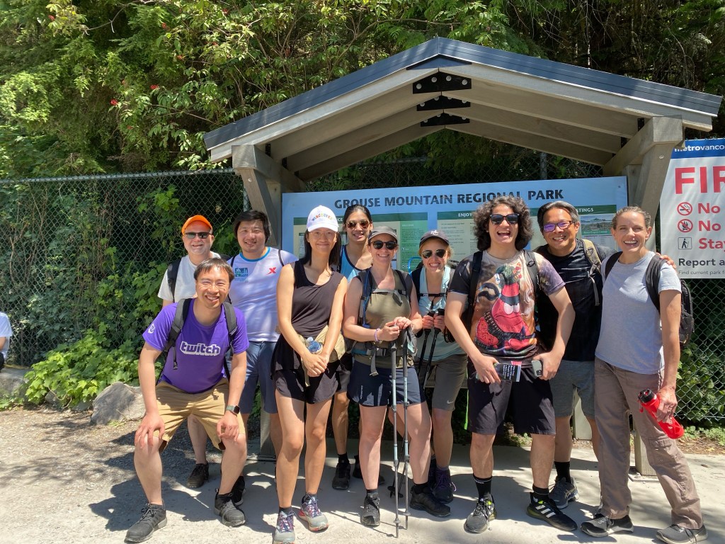 So what does INKS stand for? Answer, Income No Kids and Students. It is basically a young adults group (and yes, I stay young to be counted as among them, haha). Our INKS group has been meeting since late last fall once every month to two months for a dinner and conversation, and at our last gathering in late May, we began discussing doing the Grouse Grind together. Most of us had not done it, so there was some uncertainty among the group. However, the planning begun with me taking a “test run” up the Grind a couple days after we had gathered, and I assured the group that while the Grind was rigorous, it was doable for most and that there was an option at the 1/4th point (probably more accurately the 1/3rd point) to turn around if individuals were looking for something a bit less rigorous. So when the day arrived (yesterday), we had ten folks who had committed to at least going to the base of the mountain with us, three thought they would turn around at the 1/4th mark and because Tanya did the entire Grind the Thursday before (even with her many health limitations), she decided to stay back at the base and enjoy coffee, a book a the sun.
